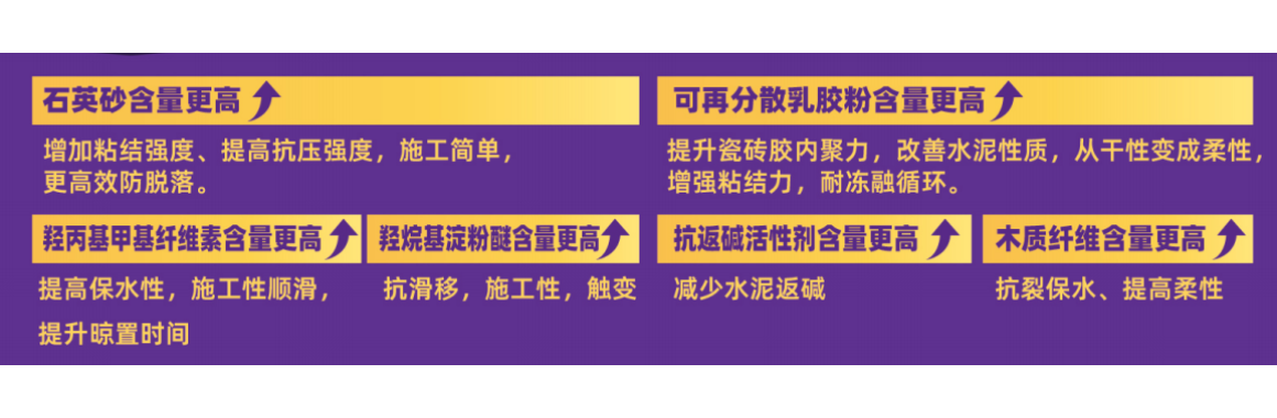 1.粘结力强,不易空鼓 2.低粘性涂刮施工柔顺3.高触变性,大型重瓷砖上墙无滑移 4.高类韧性、适应不同基面的收缩变形 5.超长晾置及调整时间,方便安装。