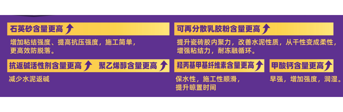 1.粘结力强,不易空鼓2.低粘性涂刮施工柔顺3.高触变性,大型重瓷砖上墙无滑移4.高柔韧性、适应不同基面的收缩变形5.超长晾置及调整时间,方便安装。