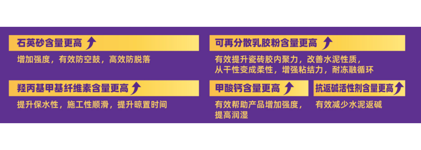 1.粘结力强、不空鼓、无泛碱 2.不需浸砖湿墙,施工便捷 3.采用薄层施工工艺,省料 4.绿色环保,无毒无害